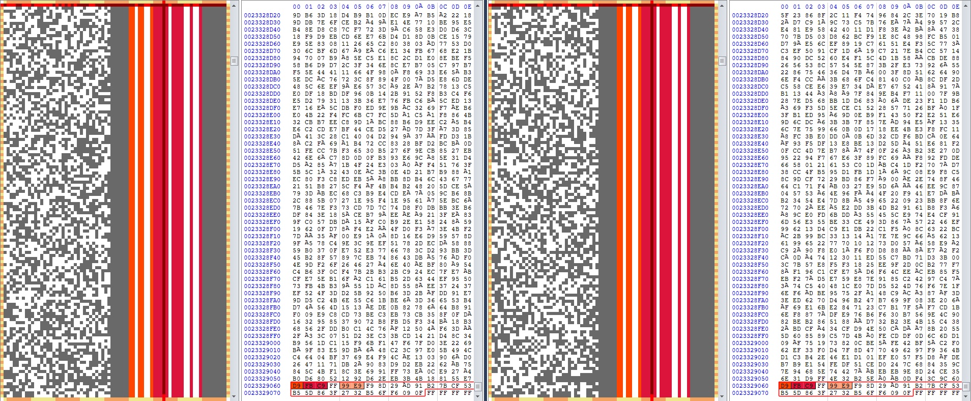 It is visible by similar patterns of data within the first two and second two dumps. At the same time, the patterns of the left and the right pairs of dumps are different.
